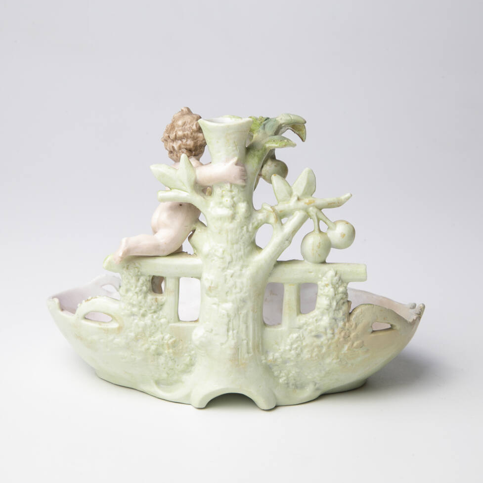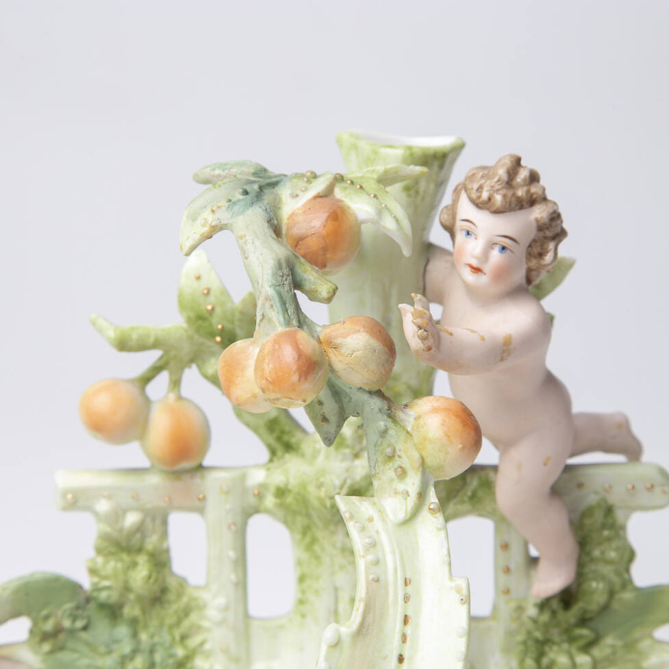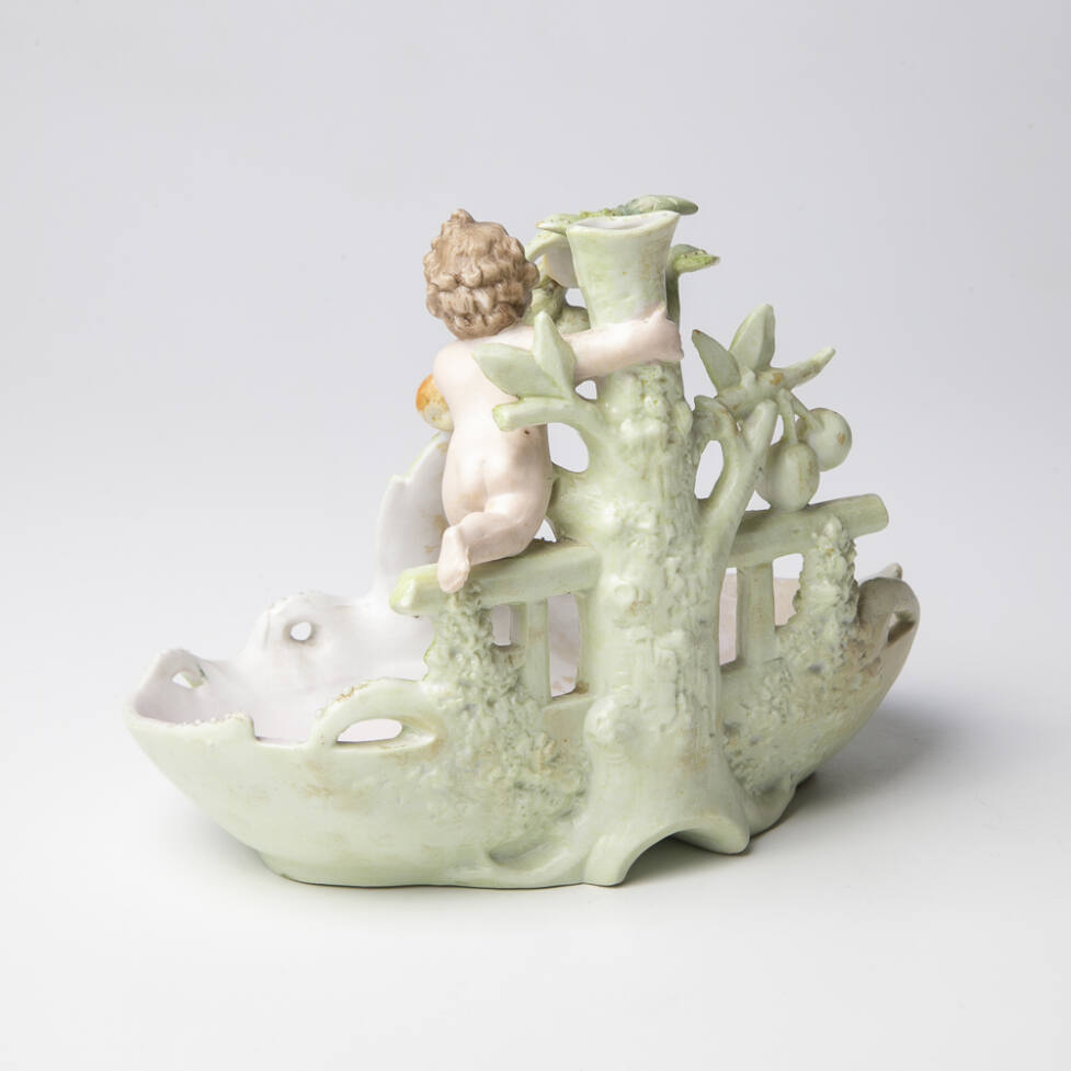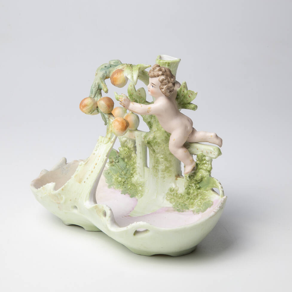 Centrinho de mesa com solifleur em porcelana europeia, com escultura de menino colhendo frutas.