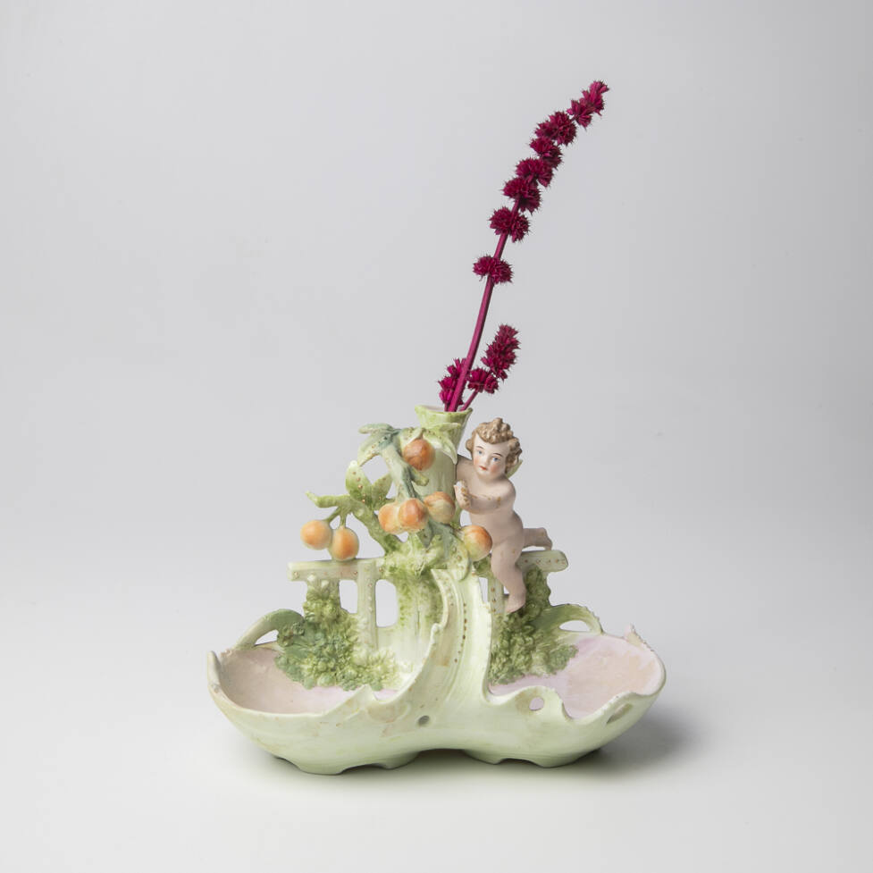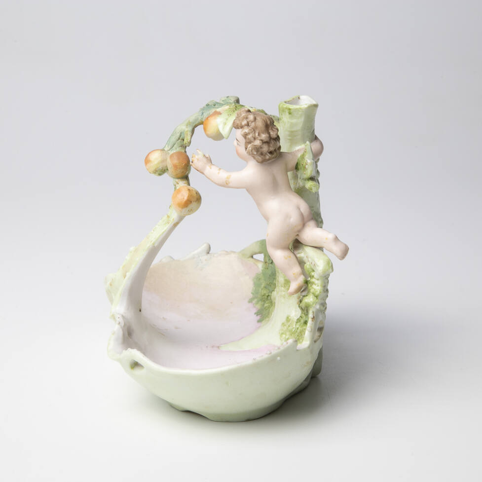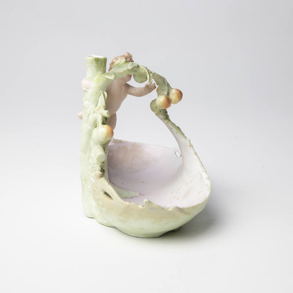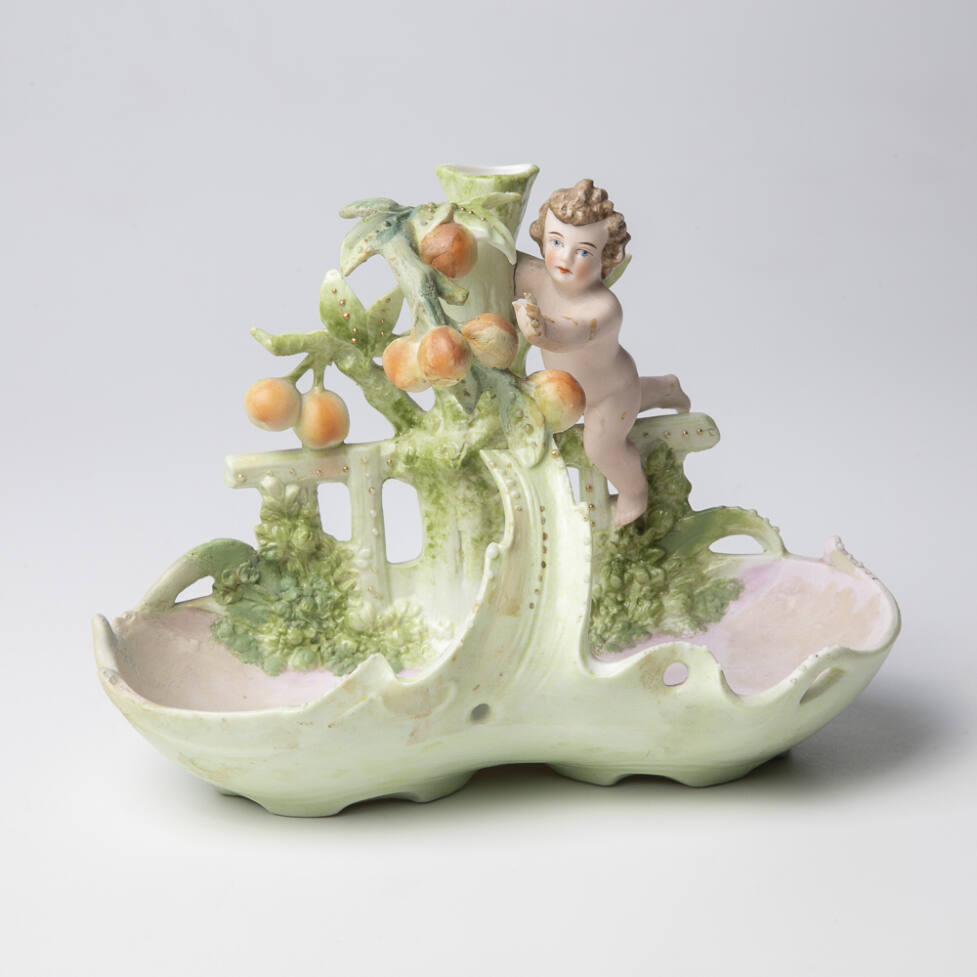 Centrinho de mesa com solifleur em porcelana europeia, com escultura de menino colhendo frutas.