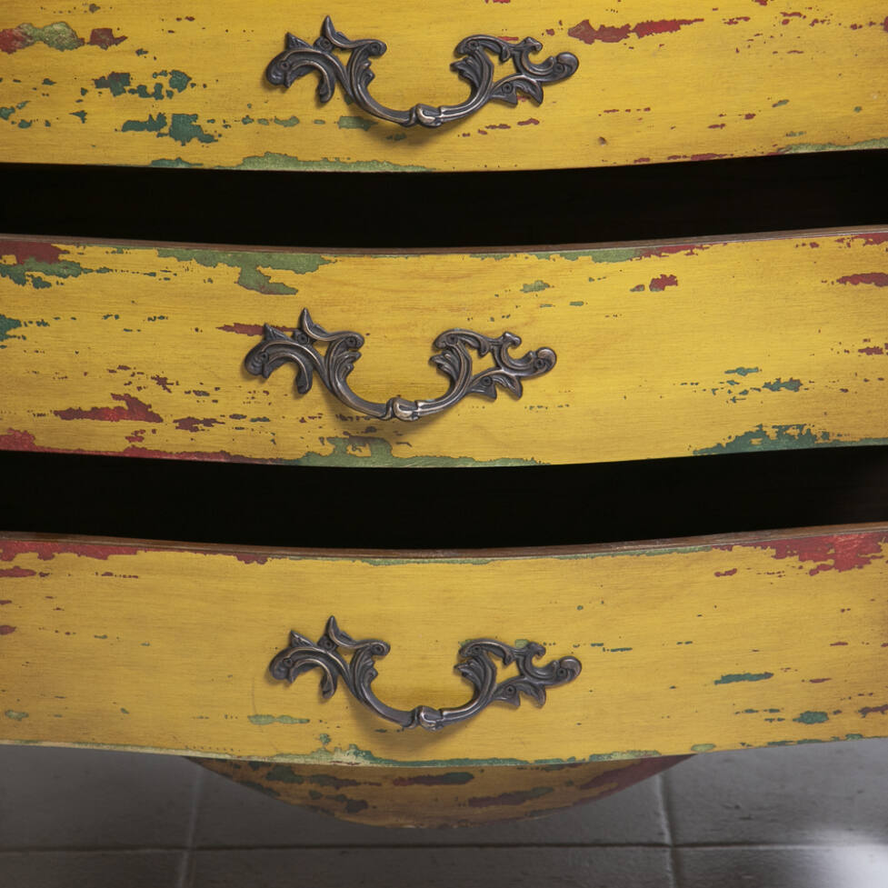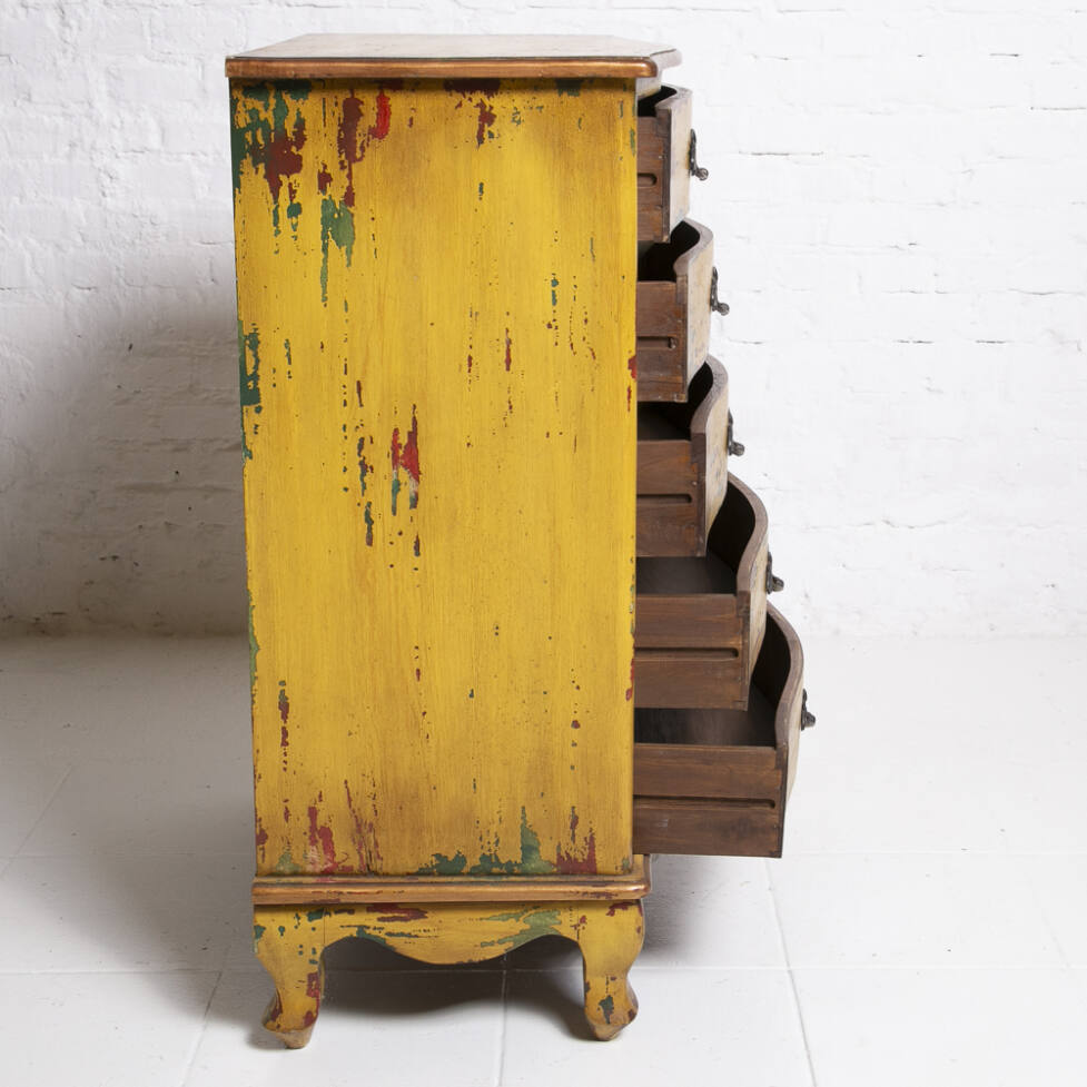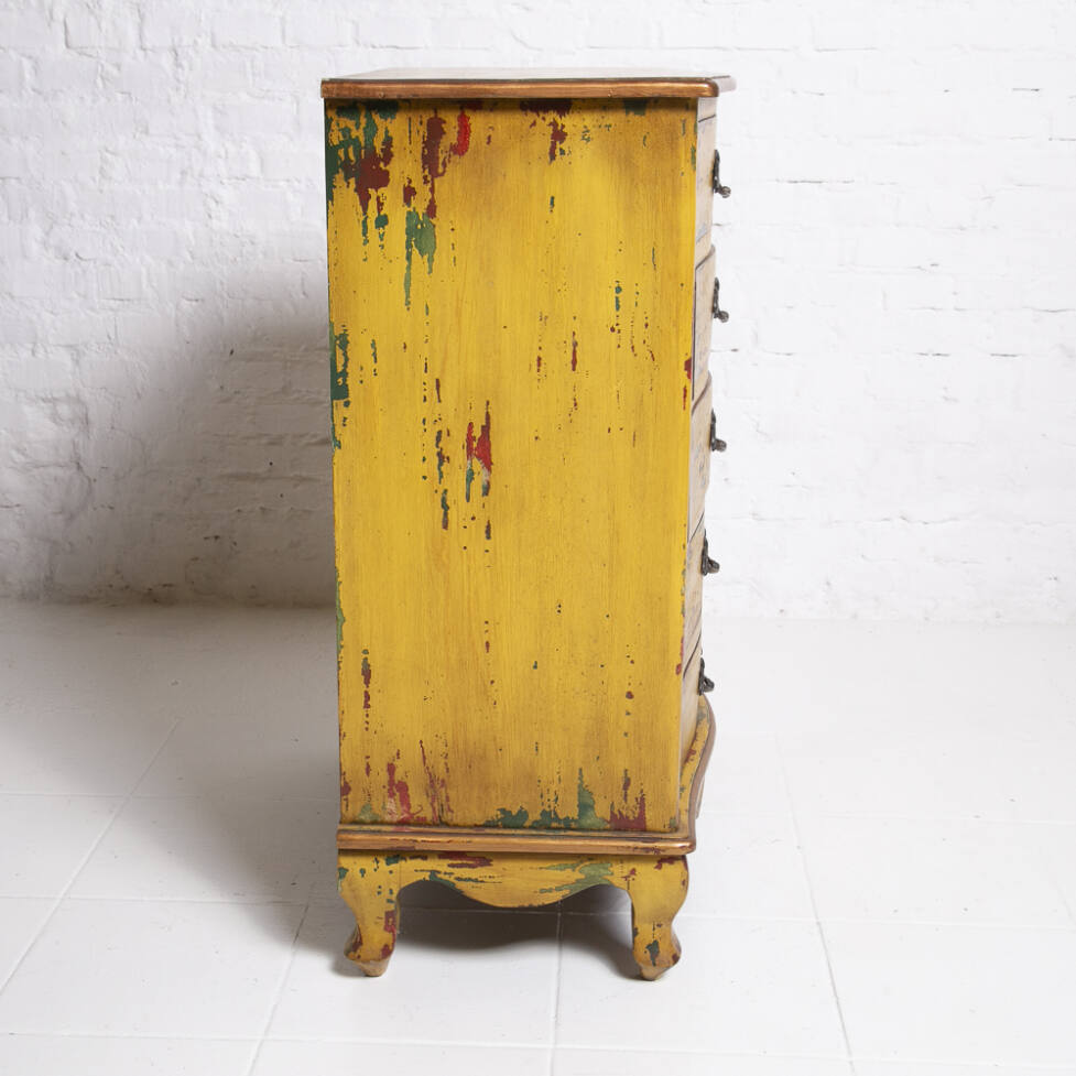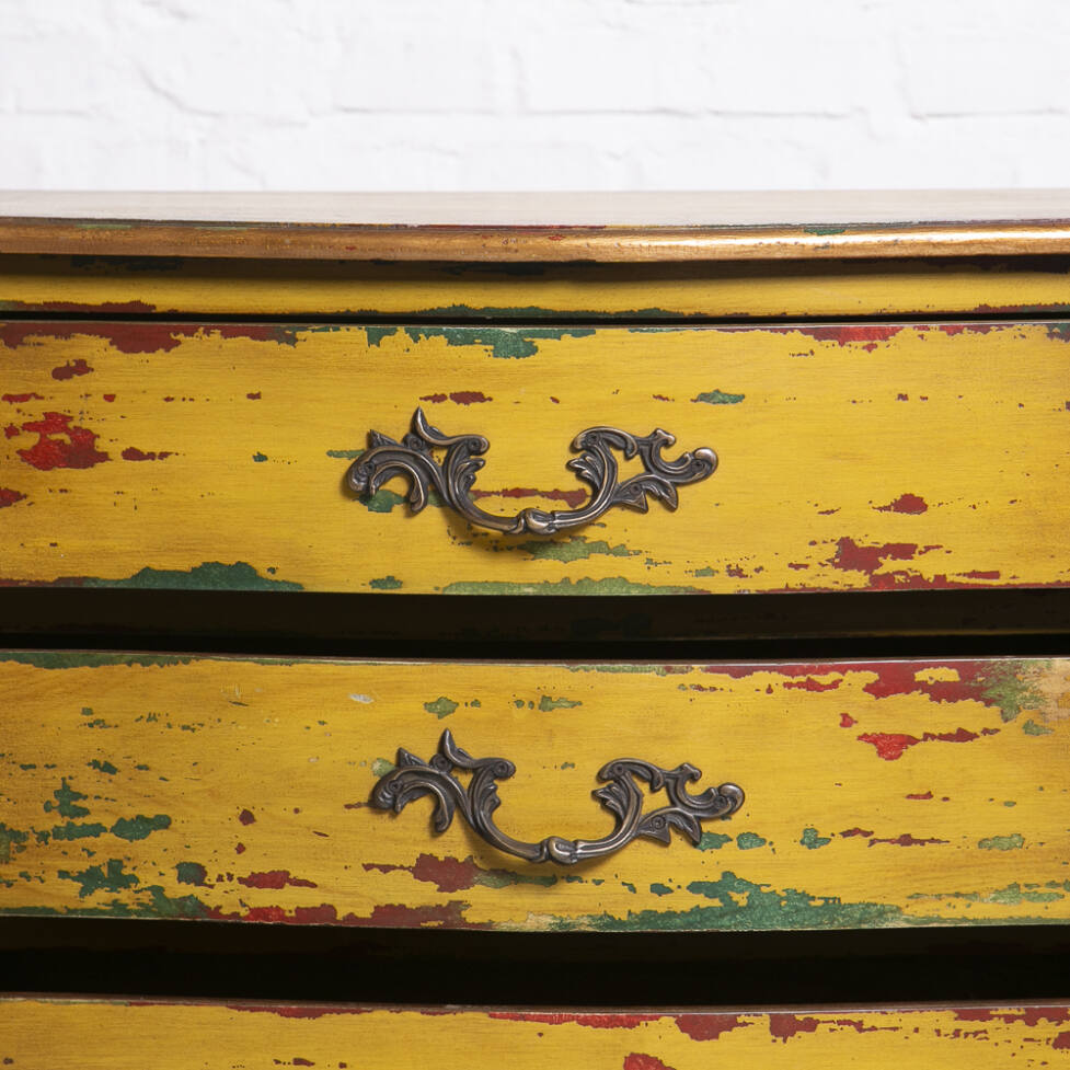 Cômoda Chippendale em madeira, com pintura em pátina colorida. Possui 05 gavetas com puxadores em bronze e pés em terminação cabriolet.
