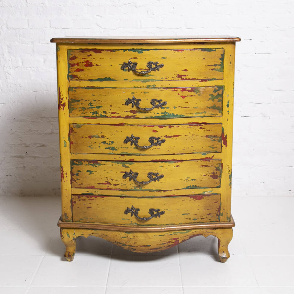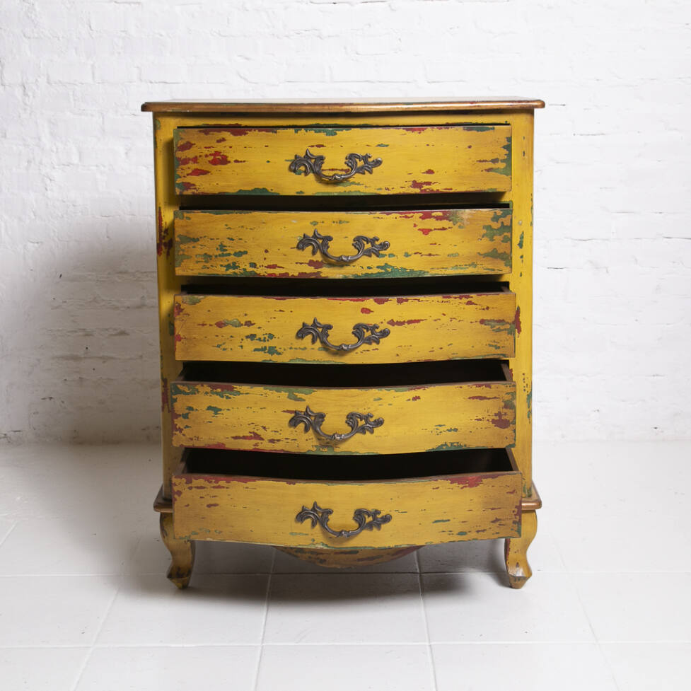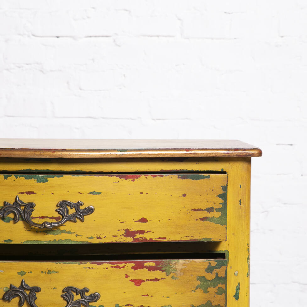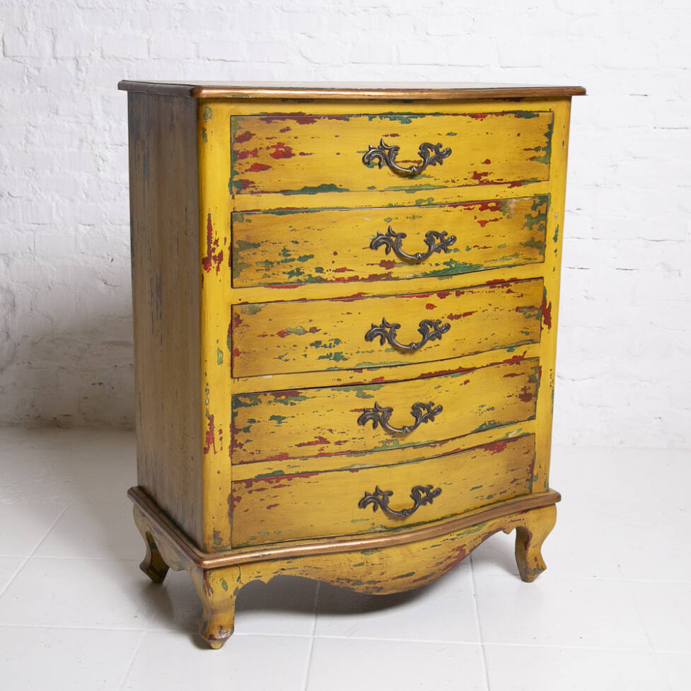 Cômoda Chippendale em madeira, com pintura em pátina colorida. Possui 05 gavetas com puxadores em bronze e pés em terminação cabriolet.