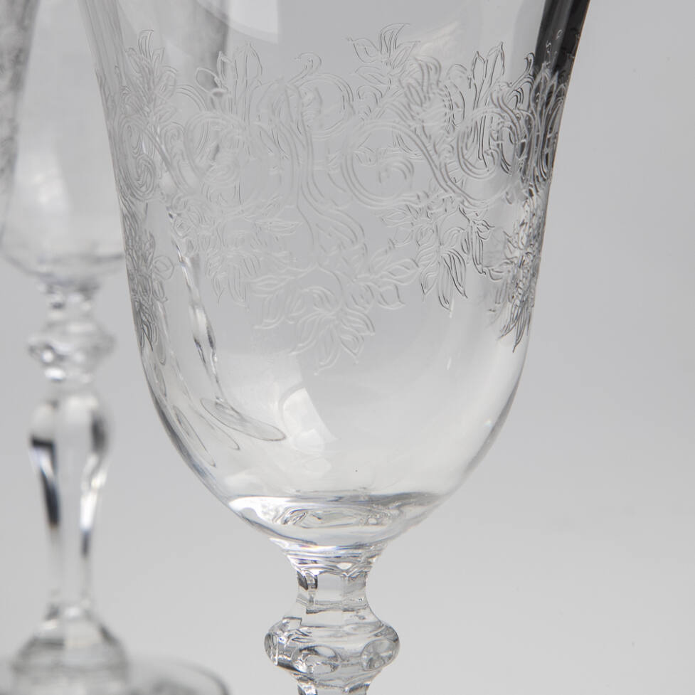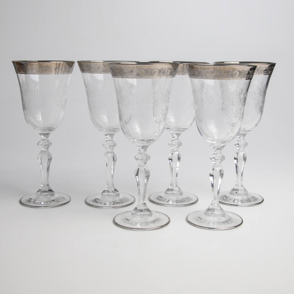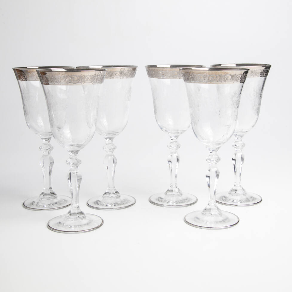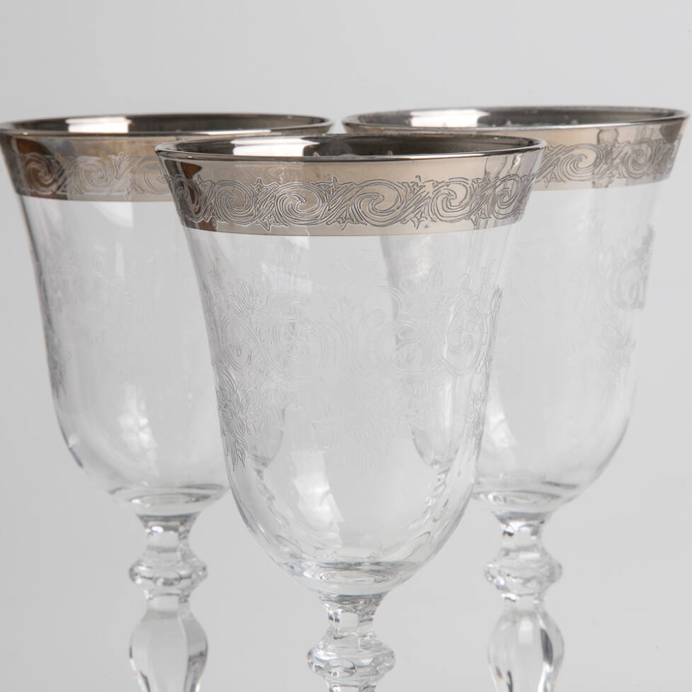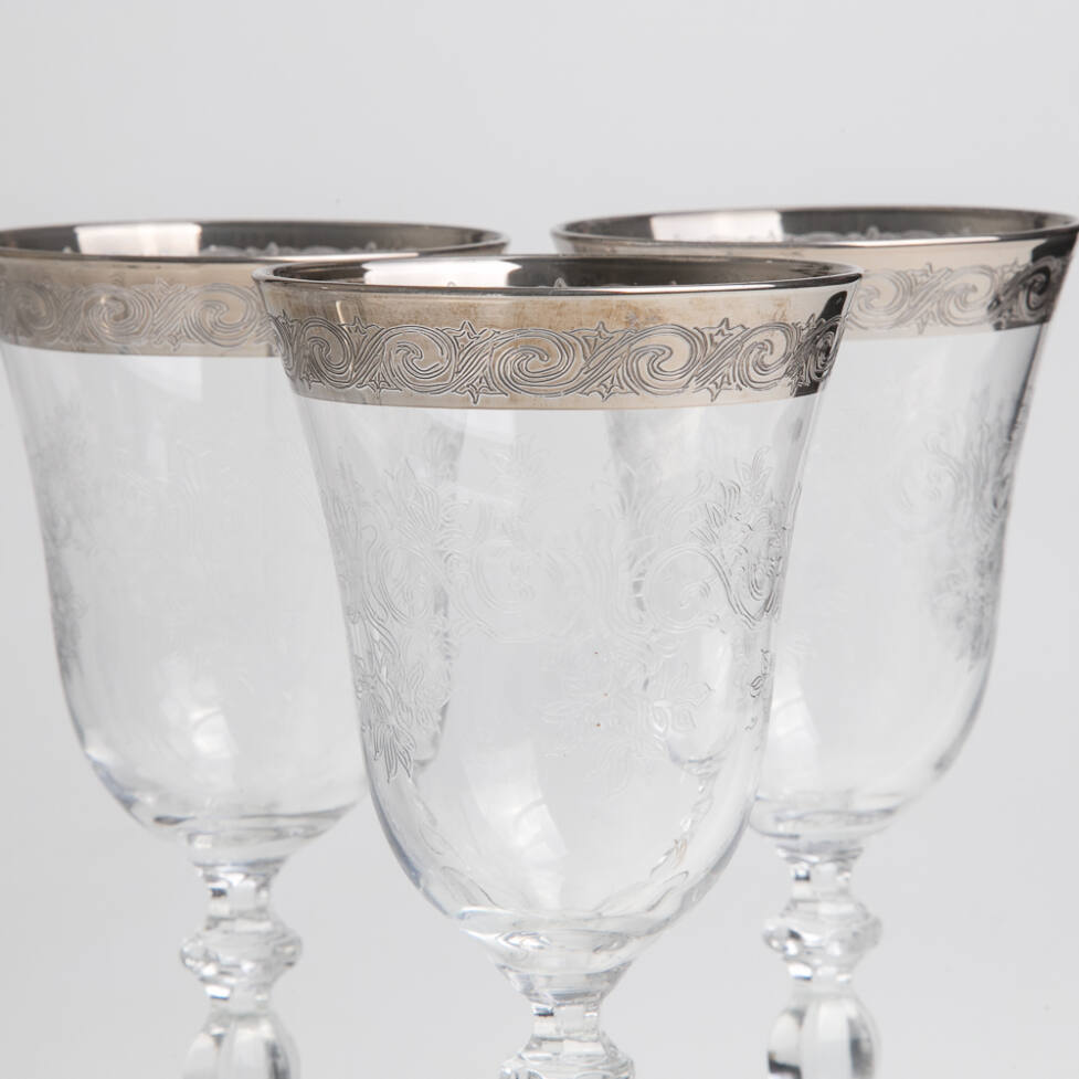 Conjunto de 06 cálices com pé alto em cristal ricamente lapidado. Borda com pintura em prata.