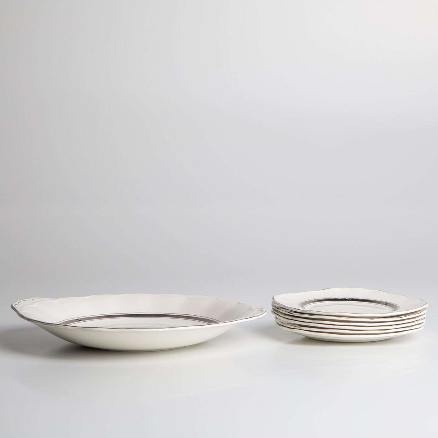 Conjunto de pratos para bolo em porcelana Creampetal da marca Grindley England, com filetes prateados.  Composto por 01 prato grande 06 pratos pequenos.