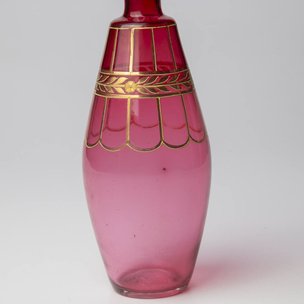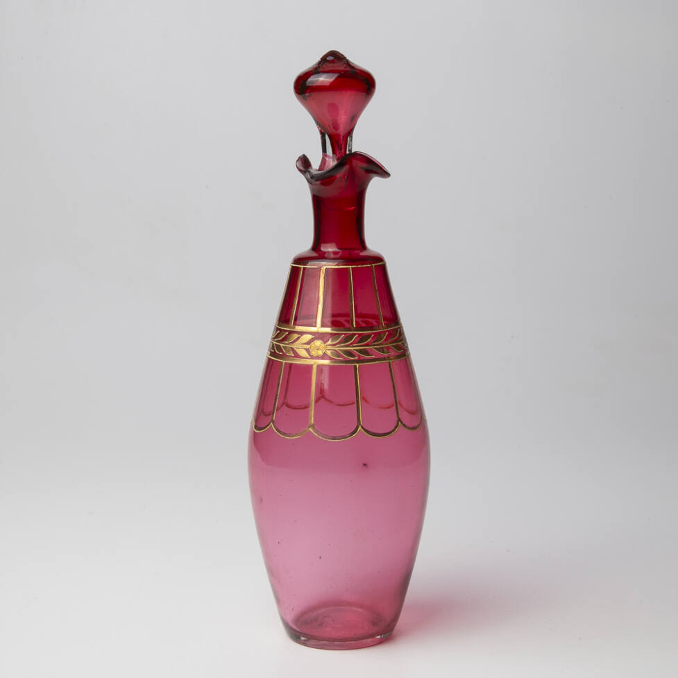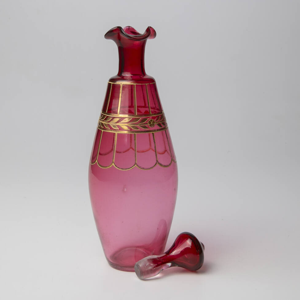 Licoreira em vidro rosa, com tampa e decoração em dourado.