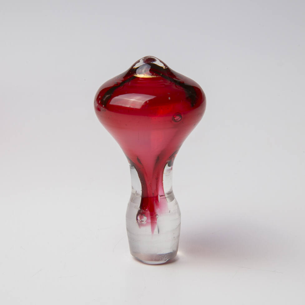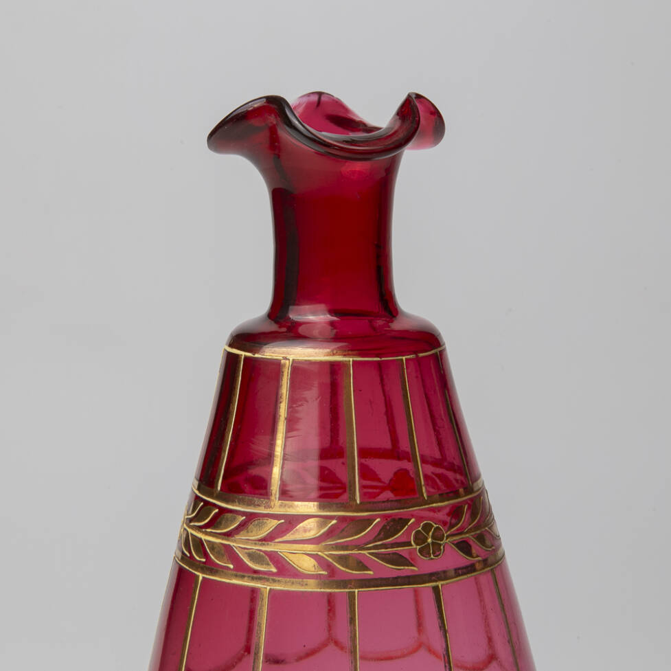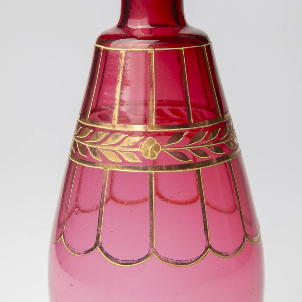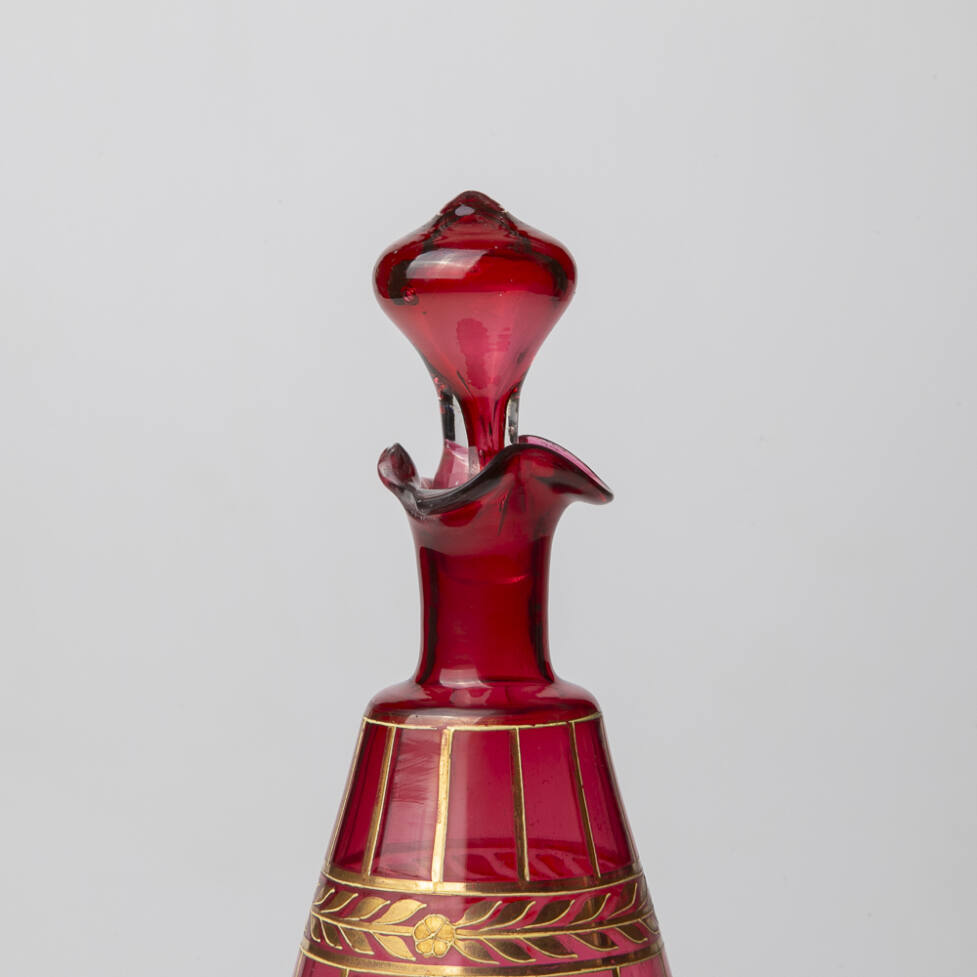 Licoreira em vidro rosa, com tampa e decoração em dourado.
