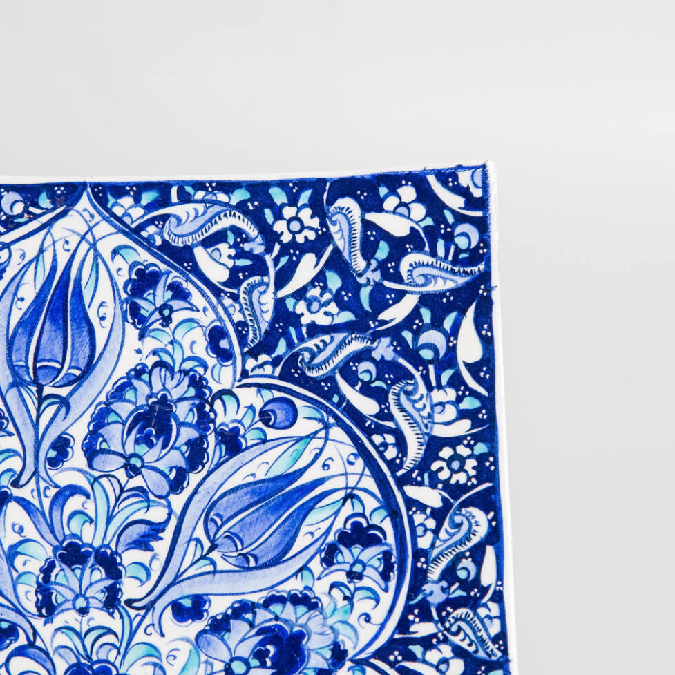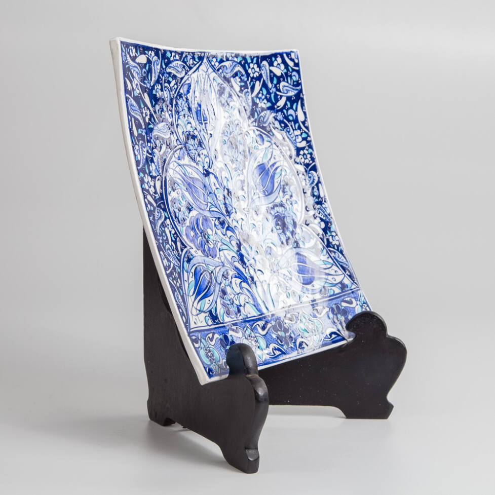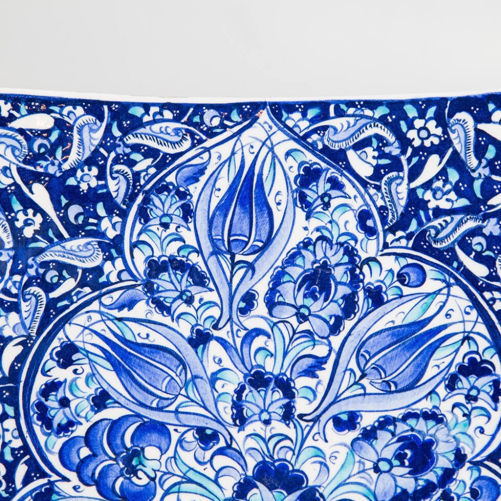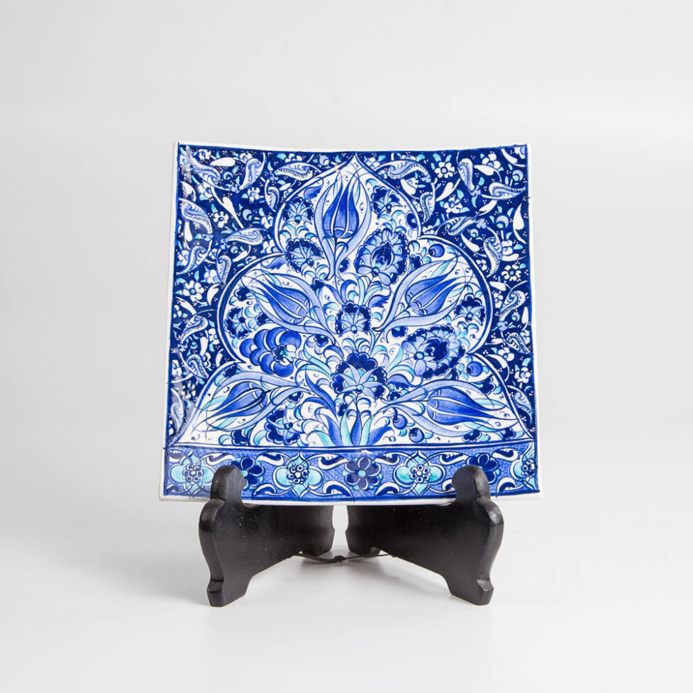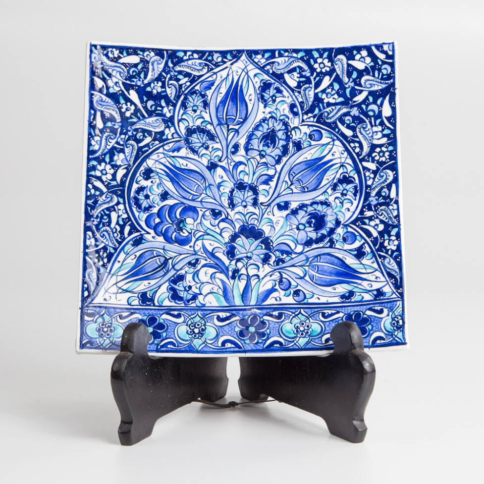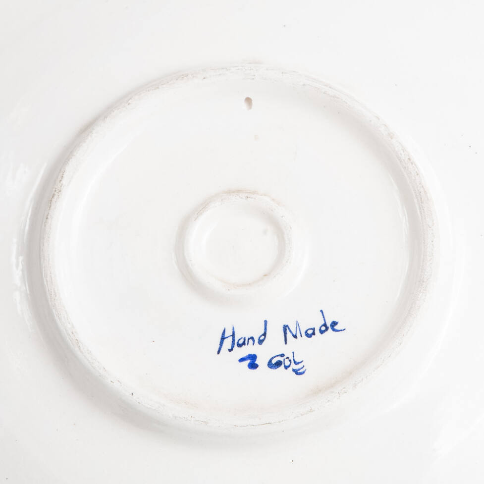 Prato decorativo em cerâmica, com pintura de flores azuis, feitas à mão.